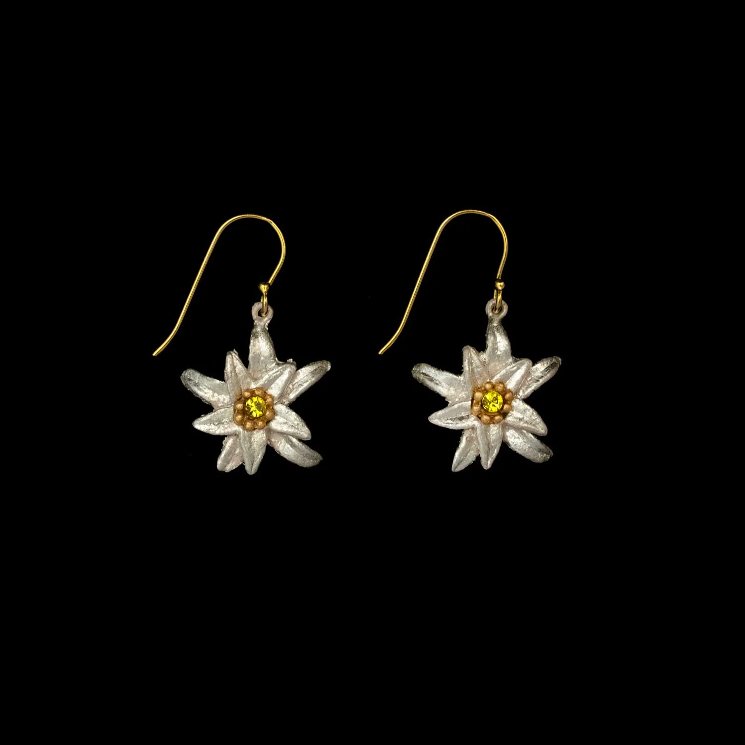 The edelweiss earrings are cast in bronze, accented with 22k white gold leaf and an Austrian crystal center set in 24k gold plate. The wires are 925 silver with a 24k gold plating.