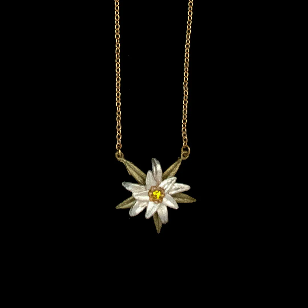 The edelweiss pendant is cast in hand-patinated bronze, accented with 22k white gold leaf and an Austrian crystal center set in 24k gold plate.