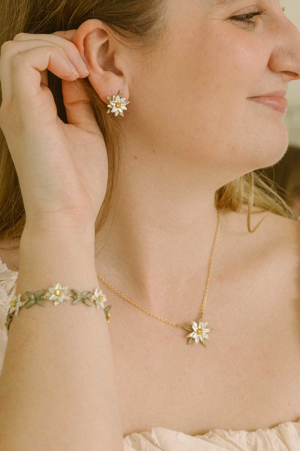Edelweiss, the national flower of Austria and a symbol of the Alps, is protected under the law to keep it safe from extinction. While it may seem harmless for tourists and sightseers to pick this cherished flower in their travels, over-picking eventually leaves the plant unable to grow. Edelweiss also holds the meaning of deep devotion due to its ability to withstand the harshest weather conditions. Not only does this flower have significant meaning in history, but in media as well, specifically in the classic movie The Sound of Music. Michael is honored to collaborate with actress Angela Cartwright, who portrayed Brigitta von Trapp in the beloved film The Sound of Music, on this beautiful collection celebrating its sixtieth anniversary.