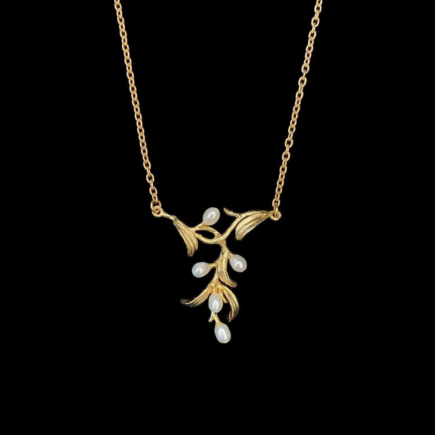 The night willow pendant is cast in sterling silver with a 24k gold finish and accented with white freshwater pearls.