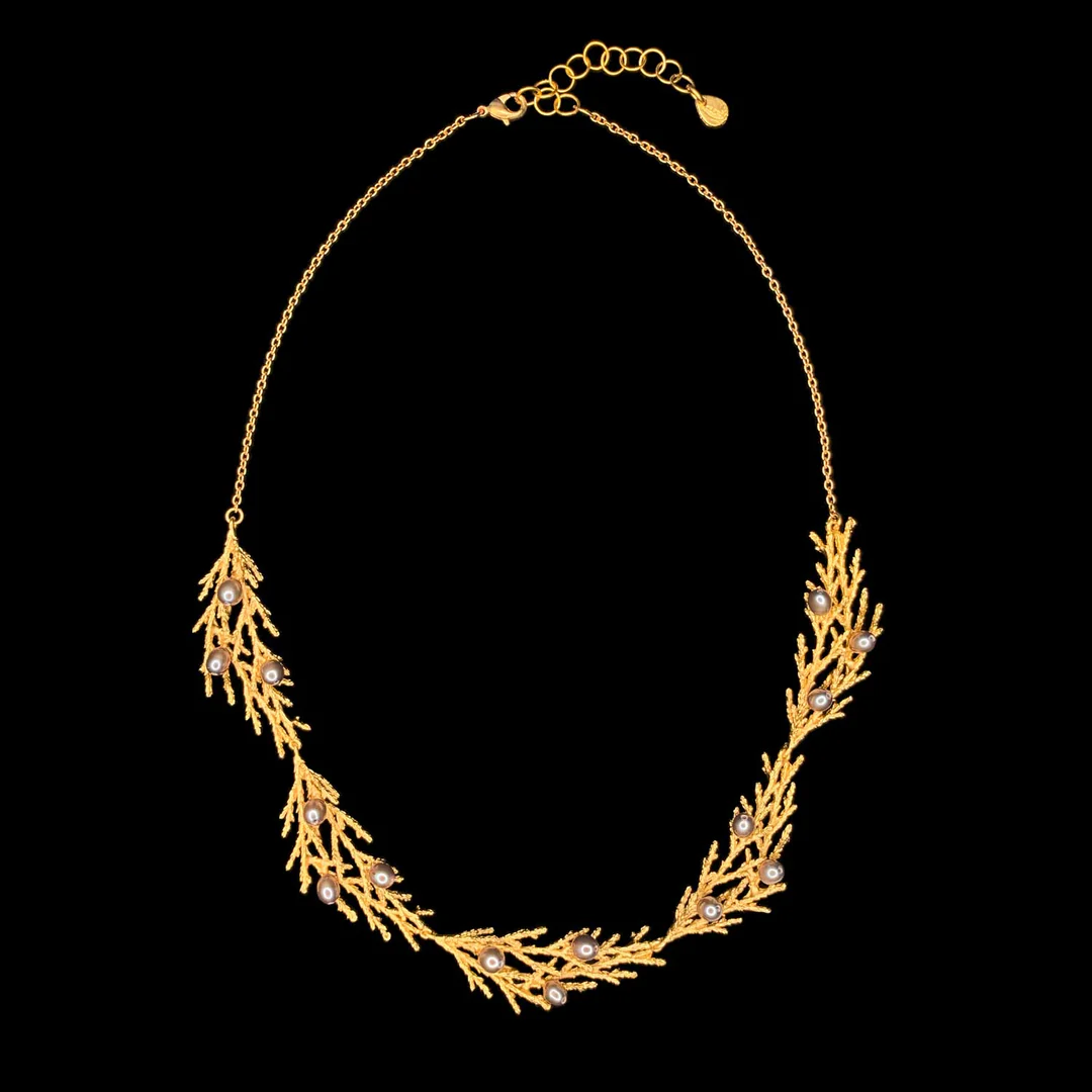 The juniper necklace is cast in 24k gold-plated bronze and accented with grey freshwater pearls, representing the juniper berries.