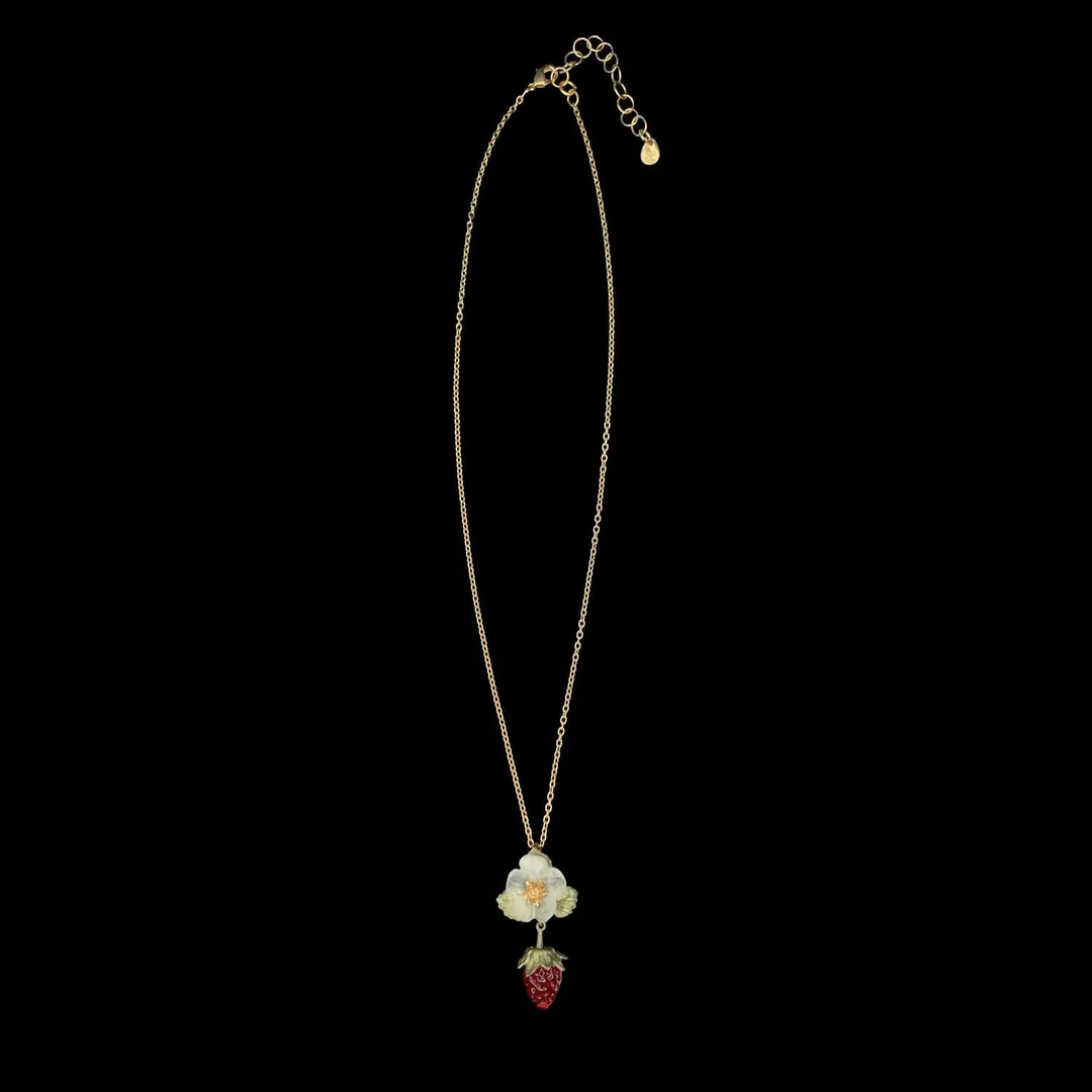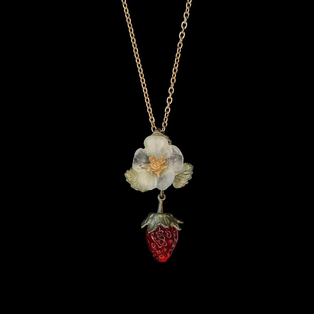 The strawberry pendant is cast in hand-patinated bronze and accented with a flame-worked red glass berry and a white cast flower with a 24k gold-plated center.